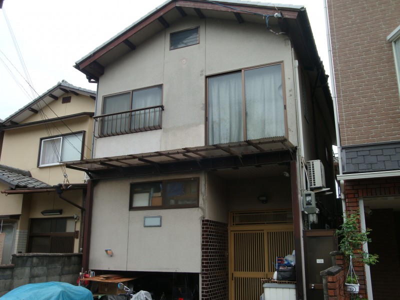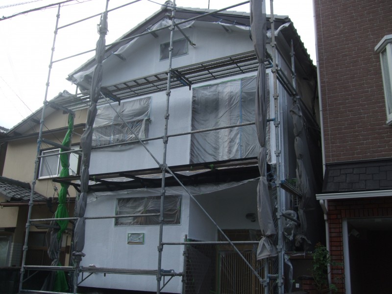 屋根葺き替え工事に伴う外壁改修工事の依頼承りました。 近隣住宅密集地でしたので外壁高圧洗浄は、御迷惑お掛けしますので浸透性カチオンシーラー処理を行い各所クラック処理・可とう形弾性改修塗材(関西ペイントアレスホルダー防水形厚膜仕様)多孔質ローラー波形模様中塗り・水性反応硬化型樹脂コスモシリコントップコートを2回塗り、破風・木部全般ウレタン樹脂塗装・鉄部下地清掃錆止め+ウレタン樹脂塗装・波板張替え施工させていただきました。 外壁色は汚れが目立たないと言うことで施主様に決めてもらいましたが、下の物置き場は共色だと暗くなるので白色で色分けと提案させていただきました。 築40年位の木造住宅で外壁もかなり傷んでおり、また密集地住宅で大変施工にも苦労しましたが近隣住宅の方々の協力もあり終えることができ感謝しております。 施主様にも大変喜んでいただきました。有難うございます。 ■お問い合わせ先 【職人直通】090-9613-3141 【24時間受付】ホームページからのお問い合わせはこちら>>
